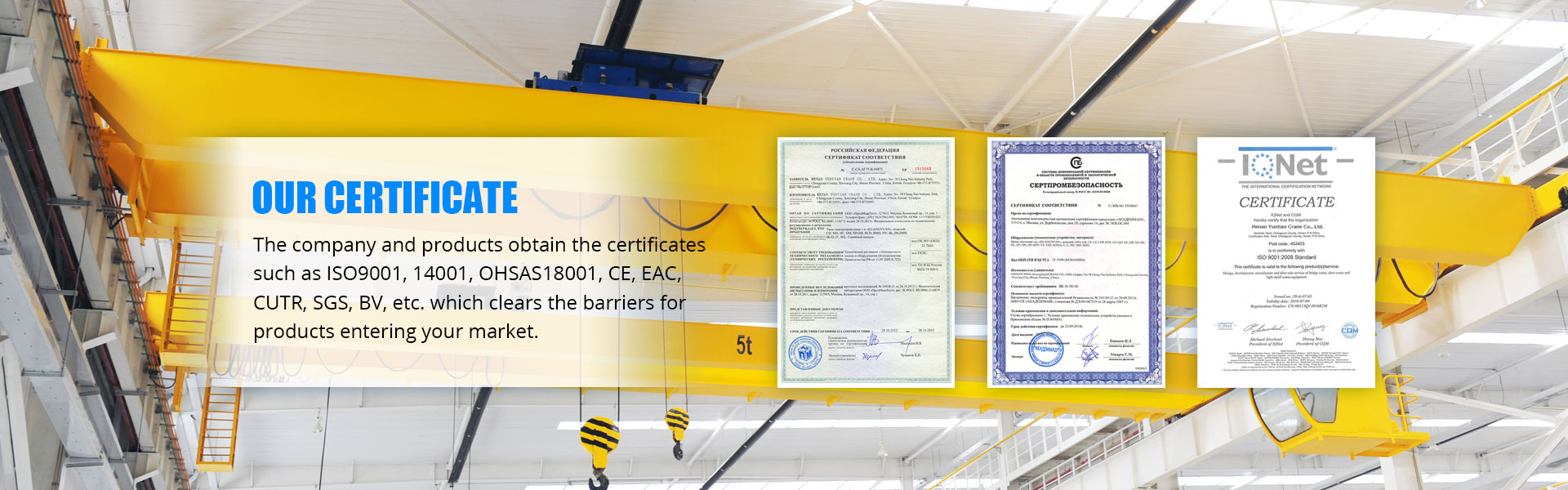 Võiksime teile pakkuda kõiki tööstusharude kraanasid 0,25tonnist kuni 900tonni, edastada GB / T 19001-2000 idt ISO 9001: 2000, GB / T 24001-2004 idt ISO 14001: 2004, GB / T 28001-2001, OHSAS 18001: 1999, CE, GOST, SGS, TUV, BV ja nii edasi.